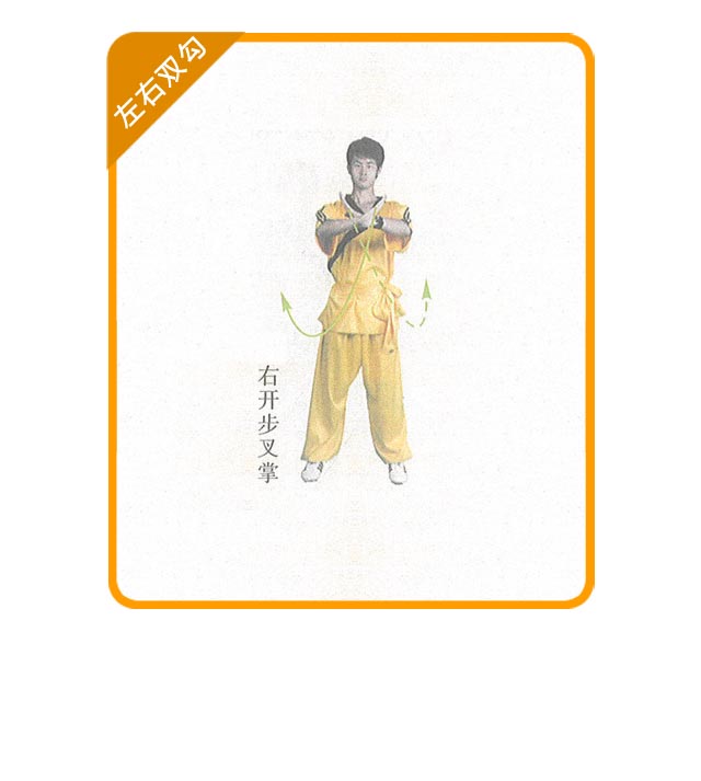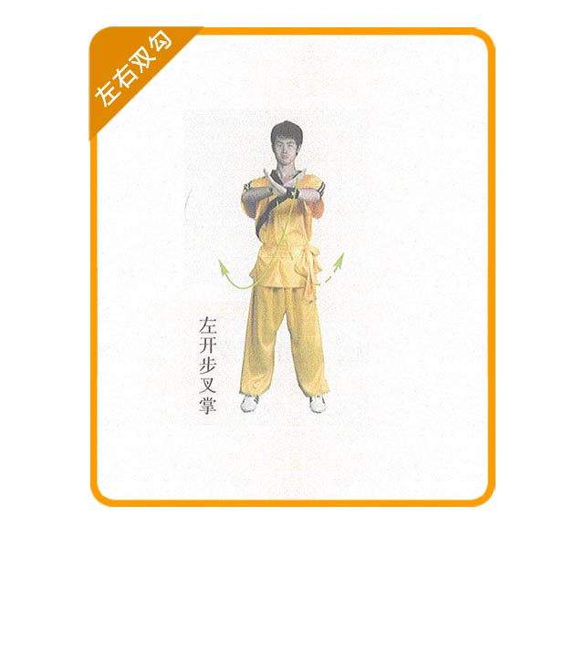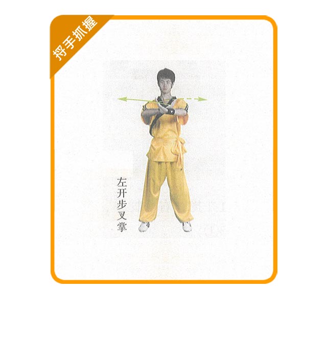 ①左脚向左开步,双拳变掌前伸交叉,左掌在前,右掌在后,目视前方。