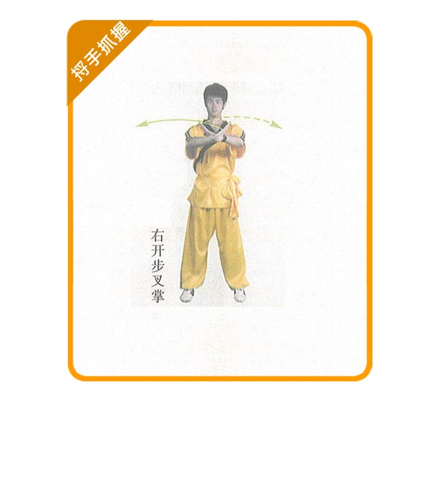 ④右脚向右开步,双臂前摆,双拳变掌在胸前交叉,右掌在前,左掌在后,目视前方。