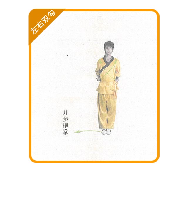 ①右脚并左脚,双勾变拳,双臂屈肘,双拳收至腰间;头向左转,目视前方。