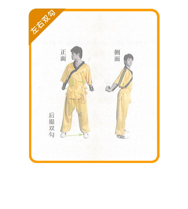 ②双臂同时后摆,双掌变成勾手,头向左甩,目视左侧方。