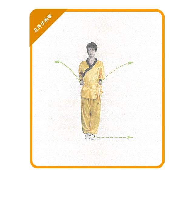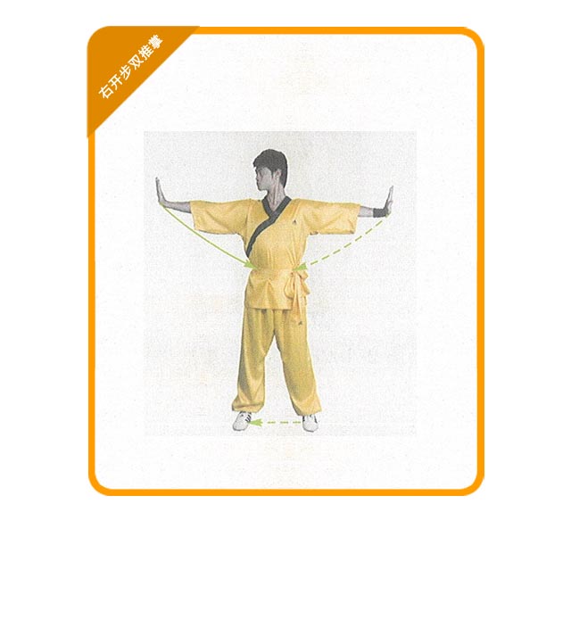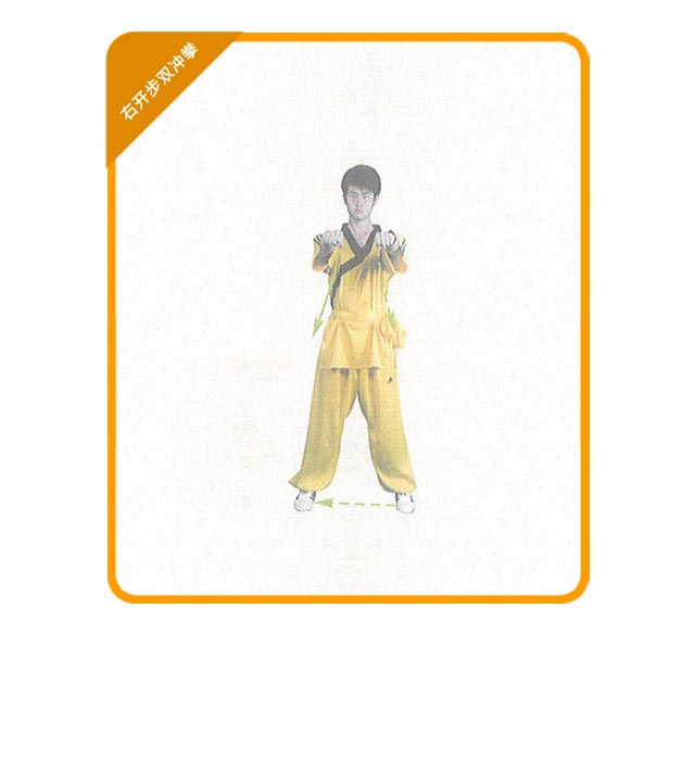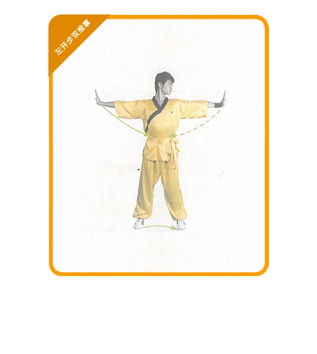 练习要点:开步、并步与冲拳、推掌要同时完成,动作要刚劲有力。