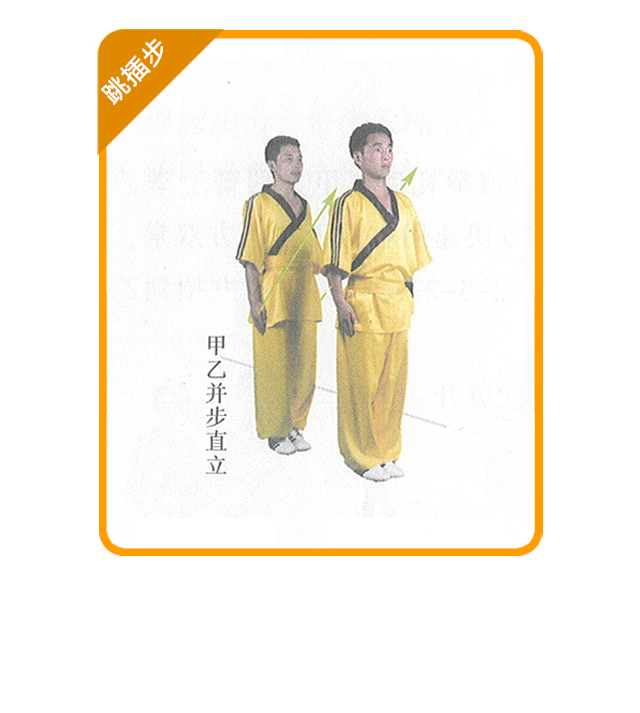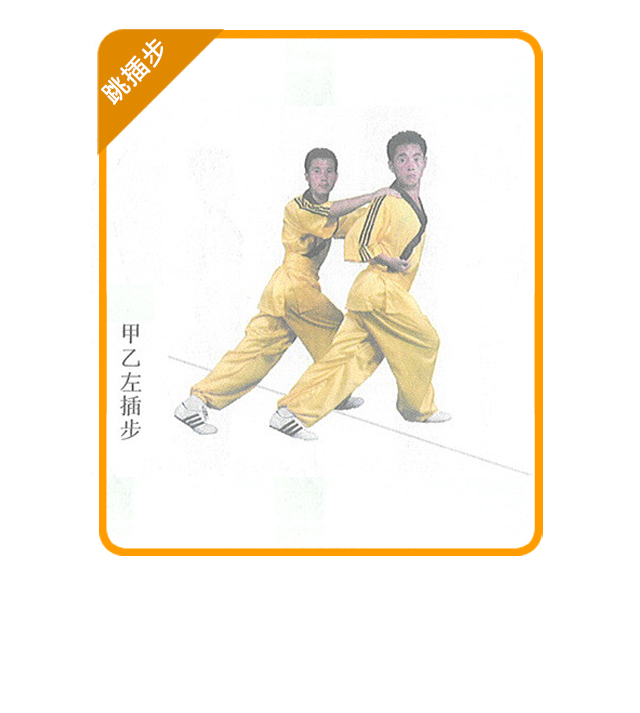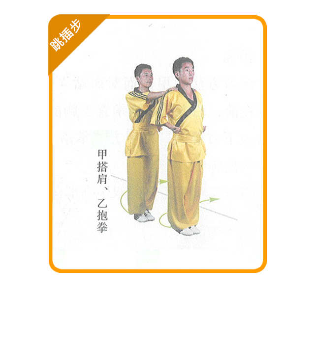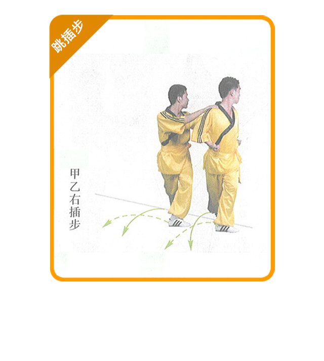 (1) 练习方法:在地面上画一条直线,甲乙在线前并步站立,互行抱拳礼后 左转;甲方双手搭乙方双肩,乙方并步抱拳;听口令在线的两侧连续做右插步和 左插步的横向跳跨。如此连续进行,可多人练习。