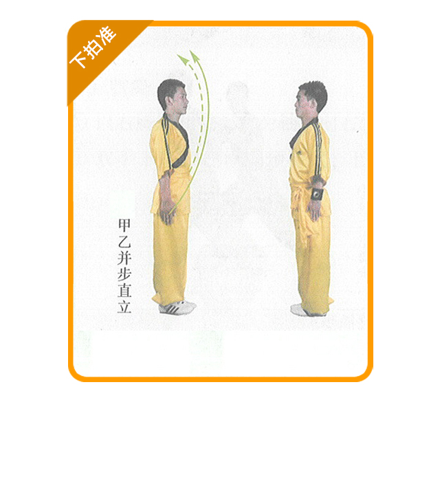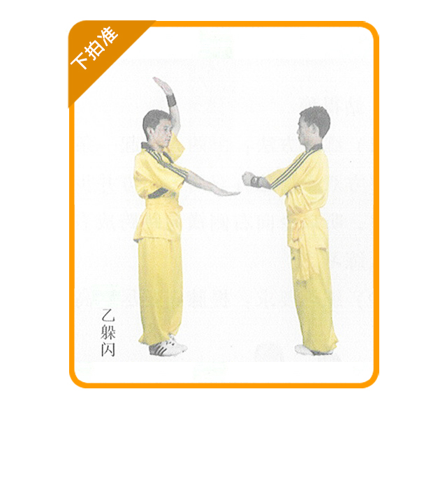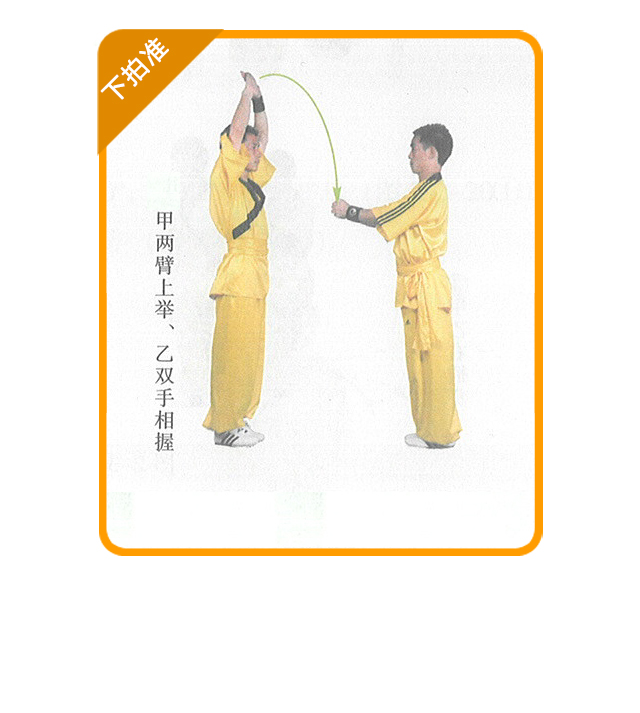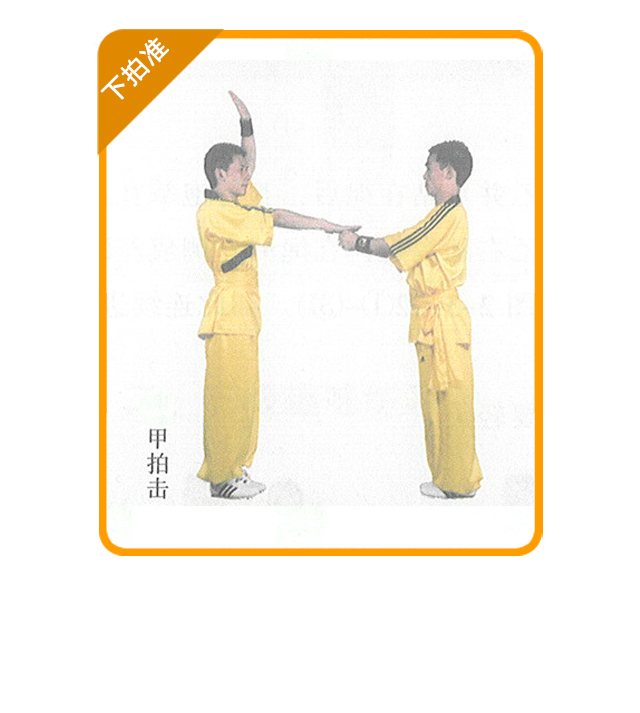 (1) 练习方法:印乙面对面站立,互行抱拳礼后,甲方两臂上举,双掌相 合,右掌在前,乙方双手抱拳置于胸前;甲方快速用右掌下拍乙方双拳,乙方双 拳向左右或下方躲闪,使甲方拍掌落空。甲方拍到乙方的手 后,双方交换练习。