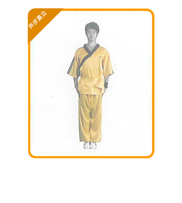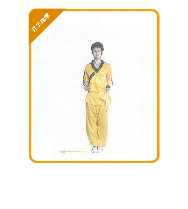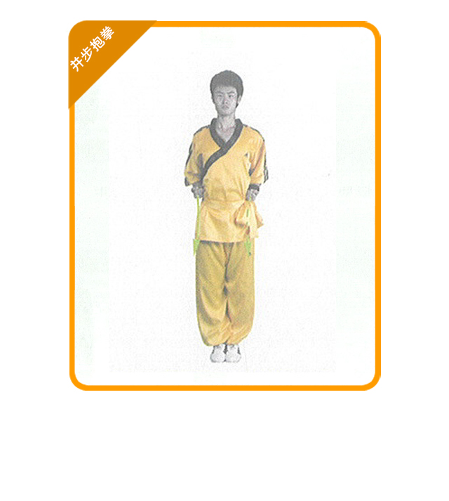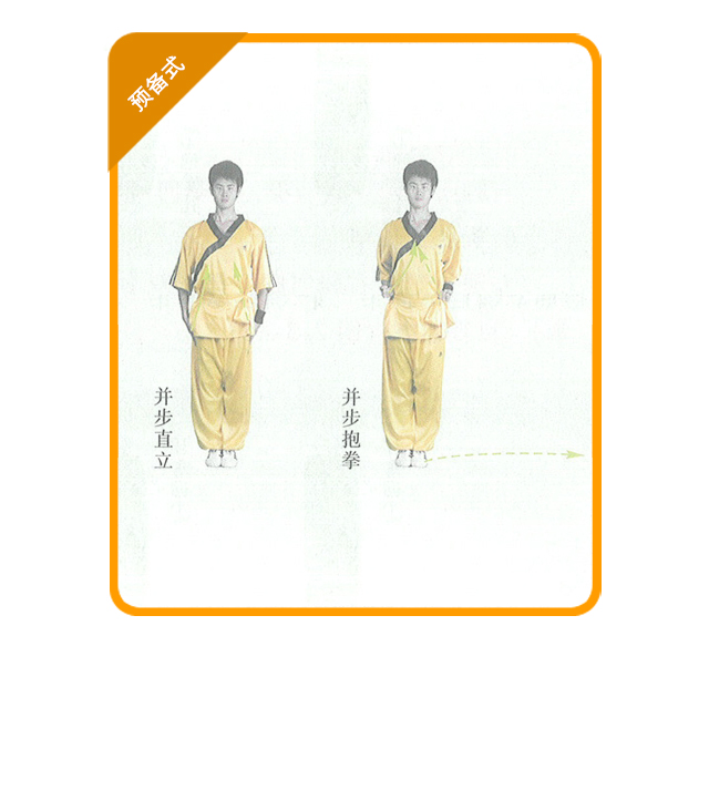 预备式:并步直立,双手握拳,屈肘收至腰间。