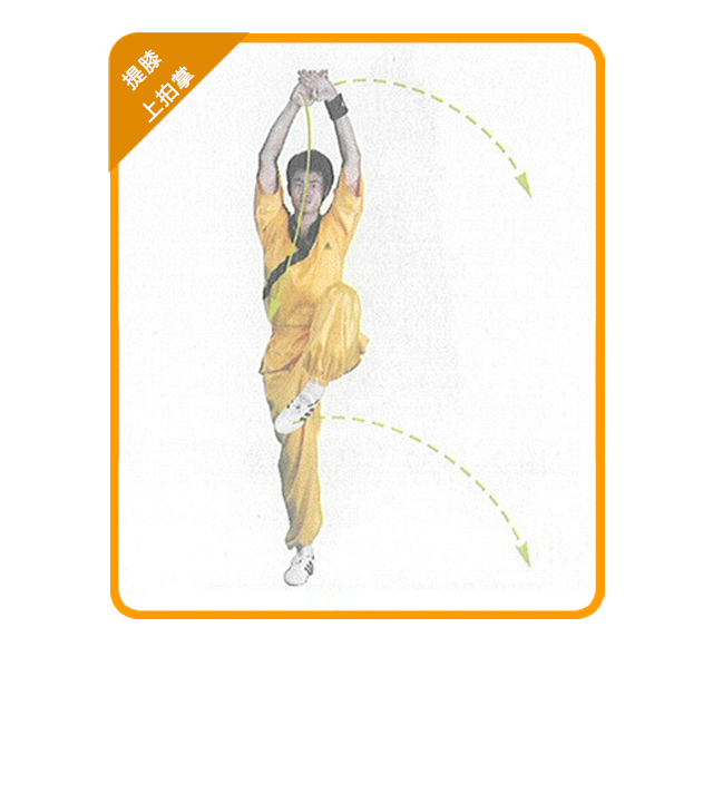 左腿站起,右腿屈膝上提;双拳变掌,两臂在头上拍击(右掌背拍击左手掌),目视前方。