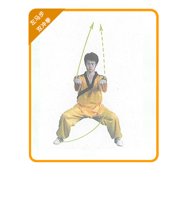 左脚向左开步成马步,双拳向前冲出,目视前方。