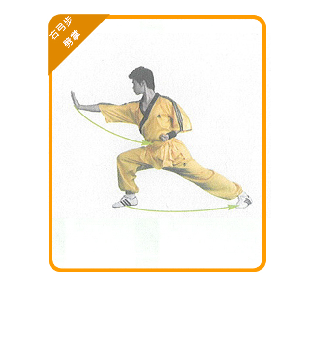 右脚向右侧落步成右弓步,右手立掌下劈,左掌变拳,屈肘收至腰间,目视左掌。