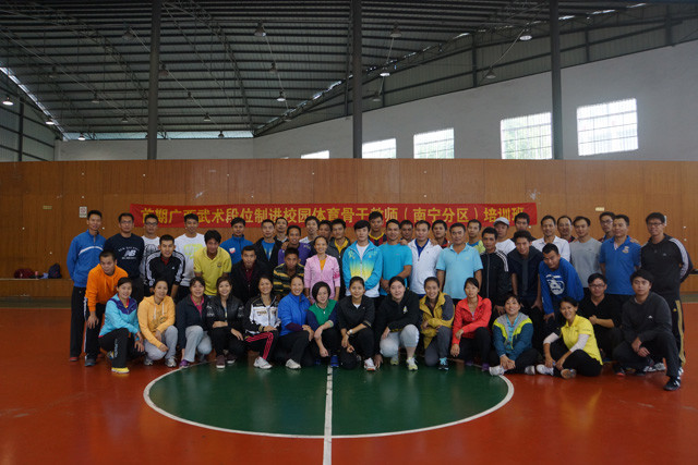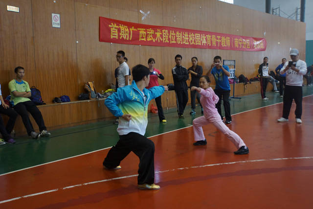 为推动广西武术进校园活动开展, 加快中小学武术师资队伍的培养,2014年11月15日至16日, 首期广西武术段位制进校园体育骨干教师培训班在广西体育运动学校篮球馆举行开班仪式,并进行集中培训。来自南宁、百色、河池80多所中小学校的体育骨干教师共122人参加了此次培训。